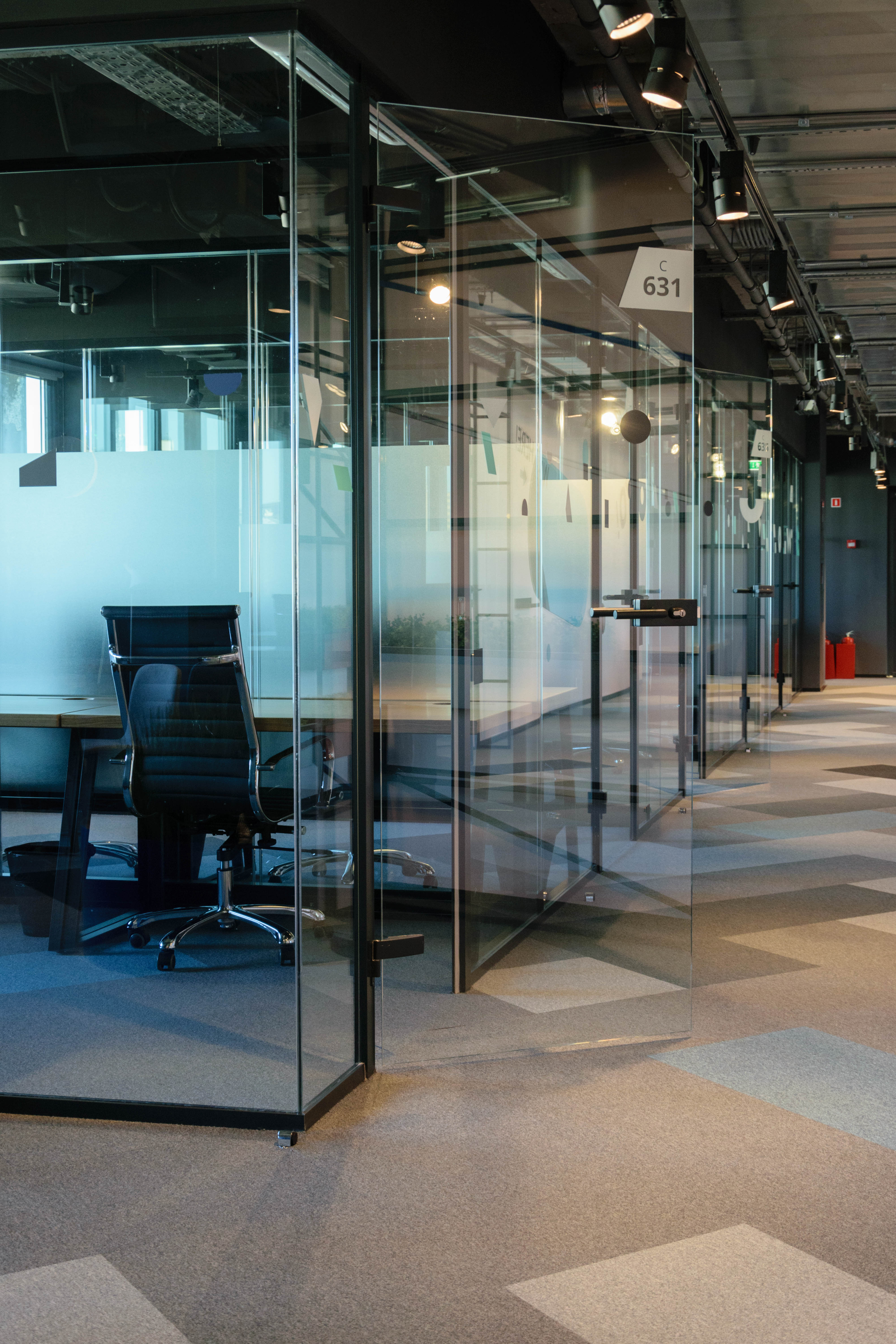Перегородки между рабочими кабинетами для максимальной звукоизоляции выполнены с применением серии NAYADA-Twin, которую отличает двухслойное остекление.